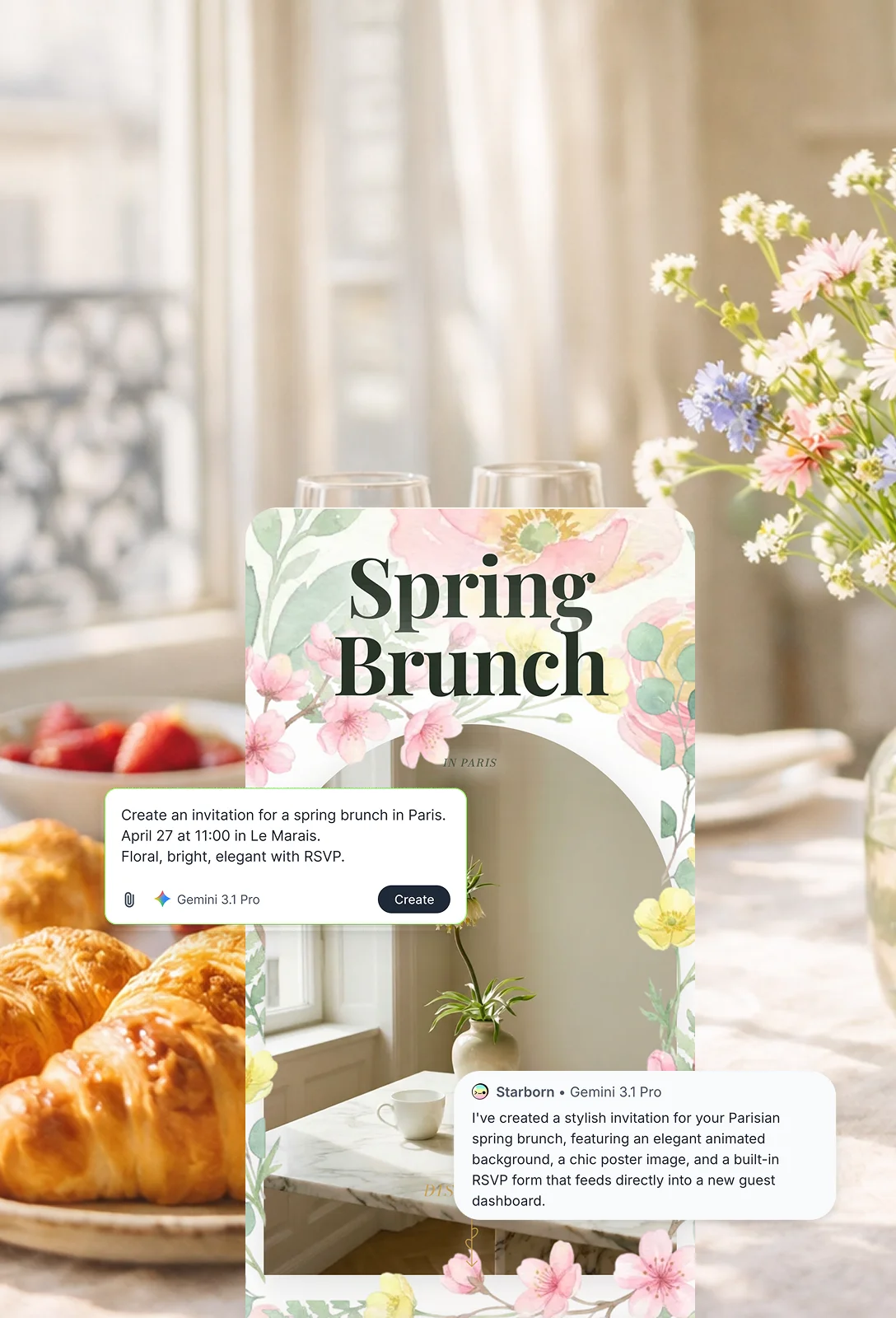 Turn your invitation into an experience — Starborn works with you like a design co-pilot, adding motion, atmosphere, and depth effortlessly.